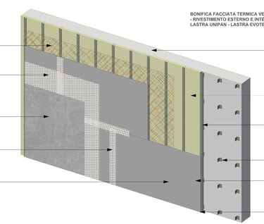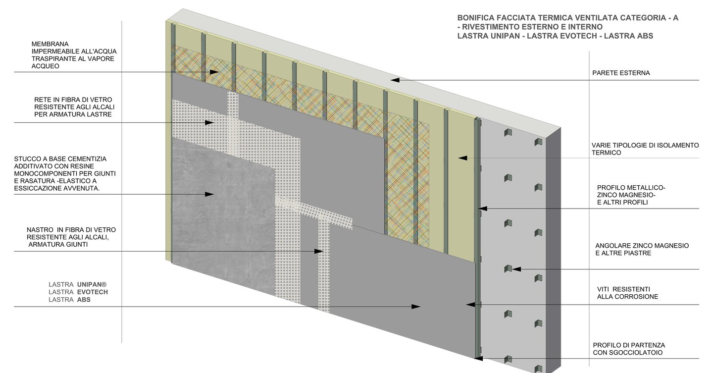 Per ristrutturare gli edifici e interrompere l’assorbimento di acqua, umidità, gelo, elevata temperatura ,del tufo,si propone applicazione di lastre da costruzione ad alte prestazioni . Queste lastre sono fissate a una sotto struttura, orditura realizzata tramite profili acciaio zinco magnesio,profili in legno, profili vetro resina_compositi , omega,C, profili relativi alla funzione ,questa applicazione crea un vuoto d’aria (vuoto sanitario) ventilazione a dimensioni variabili mm10 a mm25 e oltre. Questa intercapedine d’aria tra la parete dell’edificio e il rivestimento esterno, crea un effetto camino,che aiuta a migliorare l’isolamento termico e la ventilazione naturale, riducendo il surriscaldamento estivo e migliorando l’efficienza energetica.